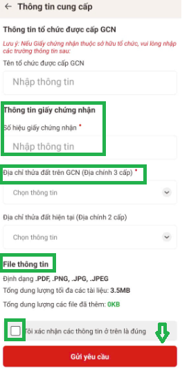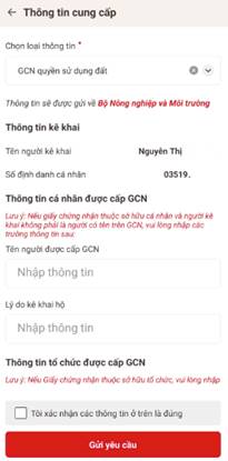 Bước 5: Nhập số hiệu Giấy chứng nhận quyền sử dụng đất và địa chỉ thửa đất ghi trên sổ đỏ. Sau đó tải lên hình ảnh hoặc file sổ đỏ ở định dạng PDF, PNG hoặc JPG. Kiểm tra lại toàn bộ thông tin, tích chọn “Tôi xác nhận các thông tin trên là đúng”, rồi ấn “Gửi yêu cầu”. Ứng dụng VNeID sẽ thông báo "Gửi thông tin thành công". Người dân có thể xem lại các dữ liệu đã kê khai trong phần lịch sử hoặc tiếp tục tạo bản mới, theo trình tự như trên. Hệ thống sẽ chuyển thông tin đến Bộ Tài nguyên và Môi trường để tiếp nhận và xử lý.