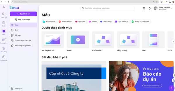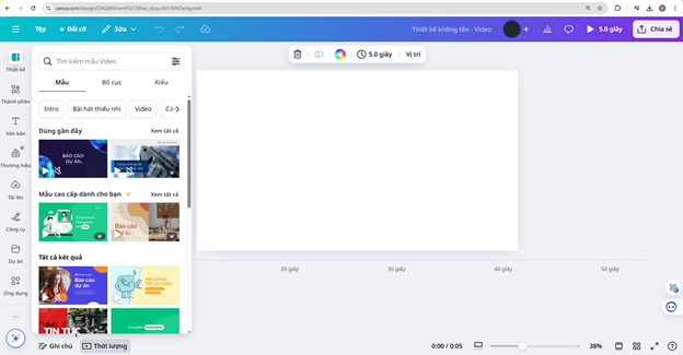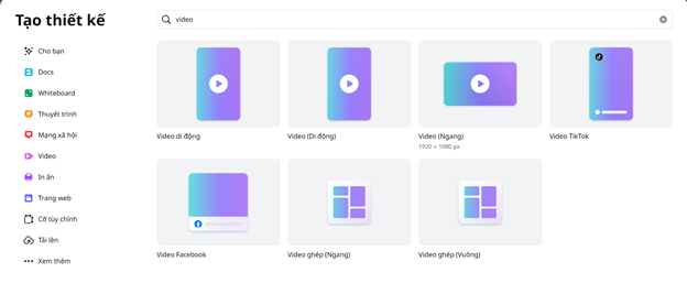 Bước 1: Vào Canva/ chọn Tạo thiết kế mới/ gõ vào ô tìm kiếm là Video/ chọn định dạng video theo nhu cầu.