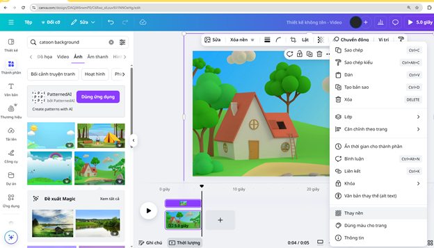 Bạn vào Thành phần/gõ nội dung nền bạn cần tại ô tìm kiếm/ chọn nền phù hợp với nội dung video của bạn/ Sau đó bạn clik chuột phải vào hình nền, chọn thay nền và chọn thời gian của nền bằng với thời gian của nhân vật bạn đã tạo.