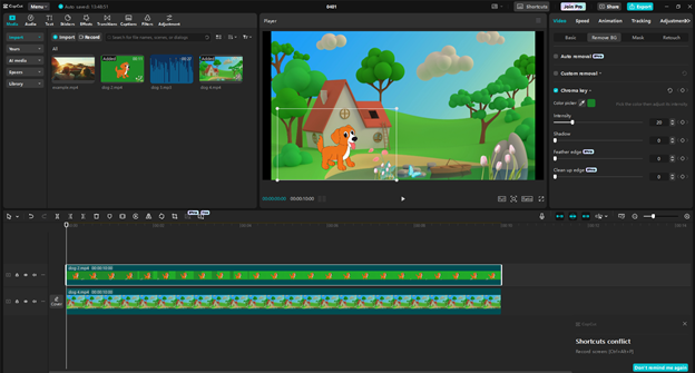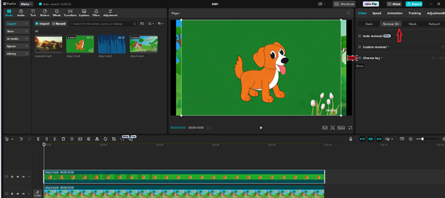 Xóa nền nhân vật: Chọn nhân vật/ Chọn animation/ Remove BG/ Chọn Chrome key/ chọn biểu tượng cái bút ngay phía dưới và đưa vào nền màu xanh/ điều chỉnh lại kích thước nhân vật.