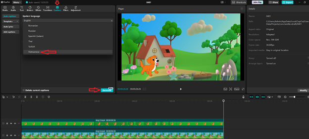 Muốn tạo phần phụ đề: Bạn chọn Captions/ Mục Spoken langauge chọn Tiếng Việt/ Click vào đoạn audio/ Chọn Generate