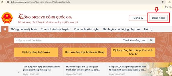Bước 1: Truy cập vào Cổng Dịch vụ công Quốc gia tại địa chỉ: https://dichvucong.gov.vn/, nhấn chọn nút “Đăng nhập” ở góc trên bên phải màn hình để bắt đầu thủ tục.