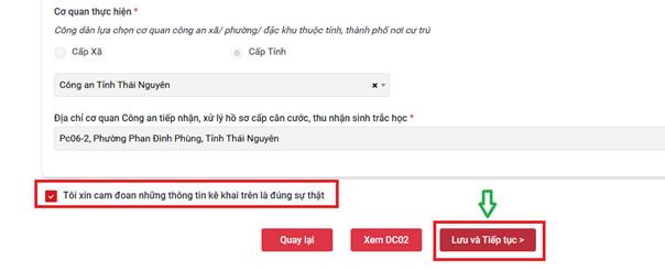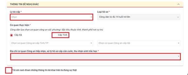 Đến mục “ Thông tin đề nghị khác”, chọn lý do cấp, cơ quan thực hiện và địa chỉ cơ quan Công an tiếp nhận, xử lý hồ sơ cấp căn cước, thu nhận sinh trắc học.