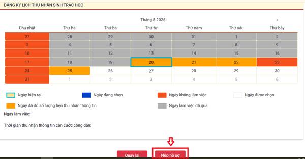 Bước 6: Đăng ký lịch thu nhận sinh trắc học và ấn chọn “Nộp hồ sơ” để hoàn tất thủ tục.