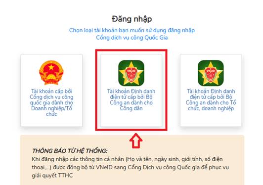 Đăng nhập bằng tài khoản định danh điện tử cấp bởi Bộ Công an dành cho Công dân.