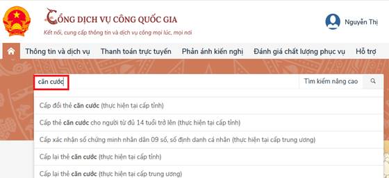 Bước 2: Sau khi đăng nhập thành công, tại ô tìm kiếm thủ tục trên giao diện trang chủ, bạn gõ từ khóa “căn cước” để hệ thống gợi ý các thủ tục liên quan.