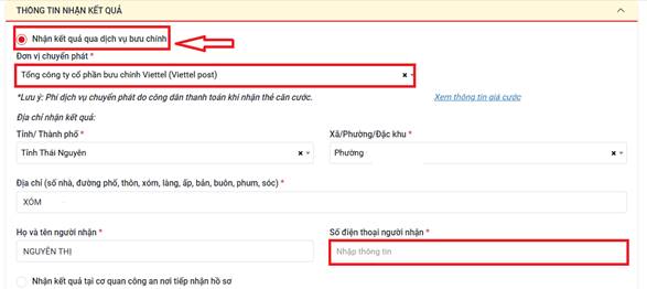 Bước 5: Sau khi điền đầy đủ thông tin, đến phần “Thông tin nhận kết quả”, nếu bạn muốn nhận kết quả tại nhà thì tích chọn “Nhận kết quả qua dịch vụ bưu chính”, chọn đơn vị chuyển phát và ghi rõ số điện thoại người nhận.