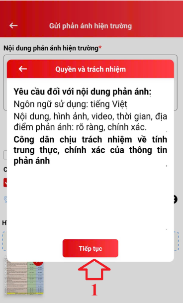 Bước 8: Hệ thống xác thực lại một lần nữa về “quyền và trách nhiệm” khi gửi phản ánh, sau đó chọn “tiếp tục”(1) là hoàn tất quy trình gửi phản ánh đến cơ quan chức năng tiếp nhận xử lý.