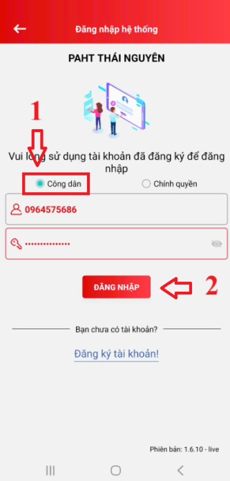 - Nhập “tài khoản và mật khẩu”, sau đó chọn “Đăng nhập”(2).