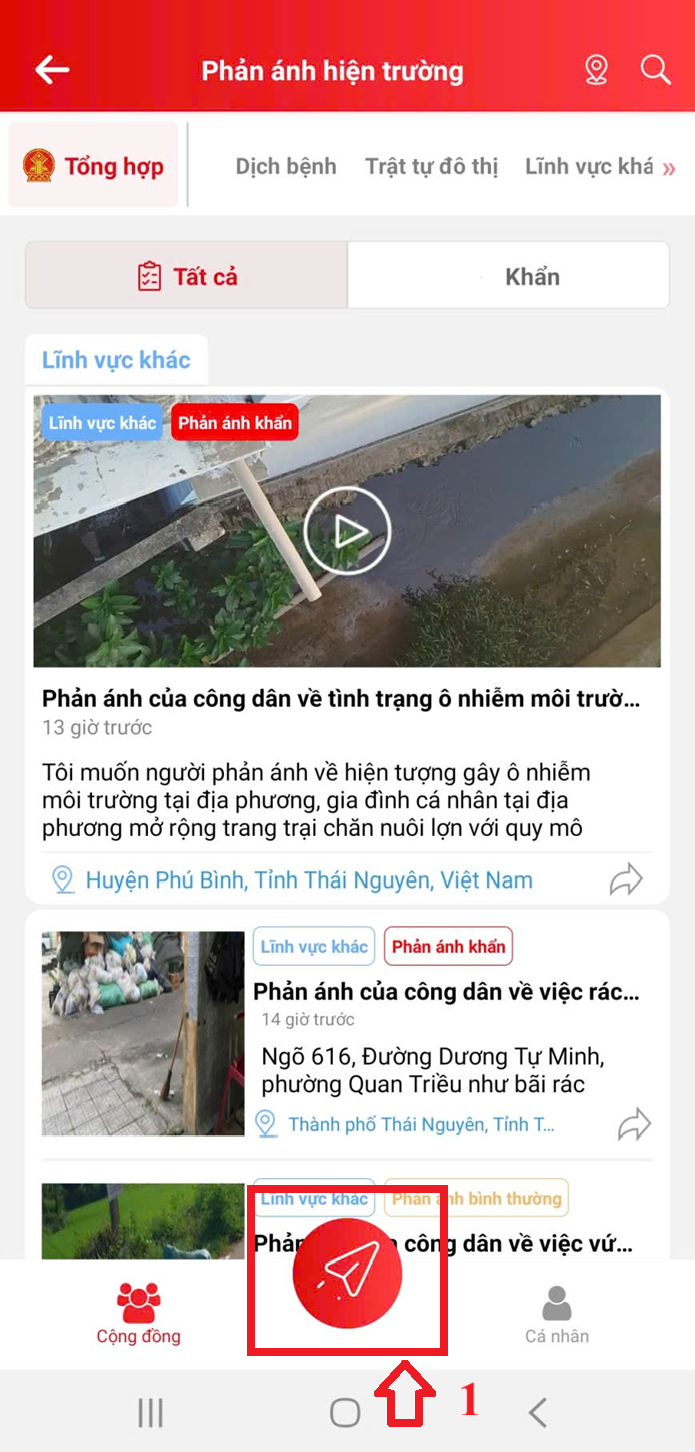 - Tại giao diện màn hình. Nhập đầy đủ thông tin phản ánh vào ô “nội dung phản ánh hiện trường” (1).