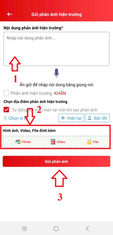 - Chọn “Video, hình ảnh, file đính kèm”(2) làm tài liệu minh chứng, sau đó chọn “Gửi Phản ánh”(3).