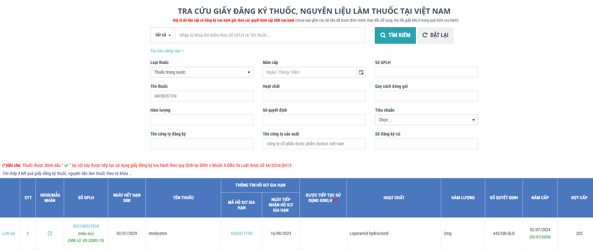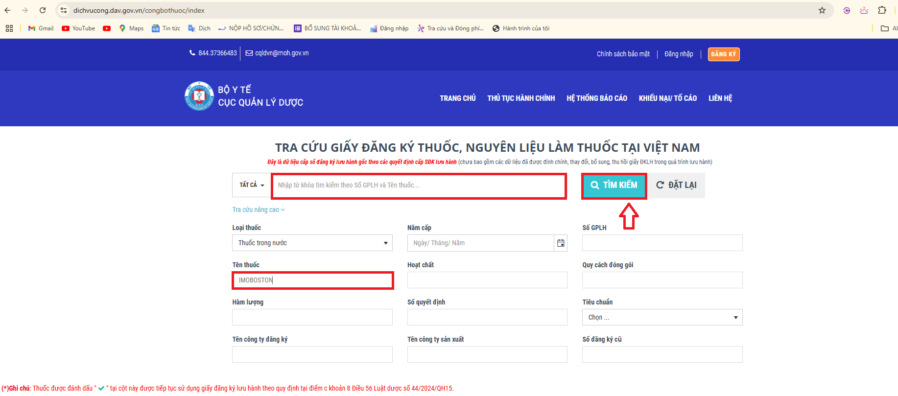 Bước 2:Tra cứu giấy đăng ký thuốc, nguyên liệu làm thuốc lưu hành tại Việt Nam, nhập thông tin thuốc cần tìm (có thể tra cứu theo tên thuốc, cơ sở sản xuất, cơ sở đăng ký, số đăng ký lưu hành thuốc…). Chọn mục "Tra cứu". Điền thông tin theo số giấy phép lưu hành thuốc hoặc tên thuốc (Imoboston, Paracetamol, Augmentin…). Nhấn nút "Tìm kiếm" để hiển thị kết quả.